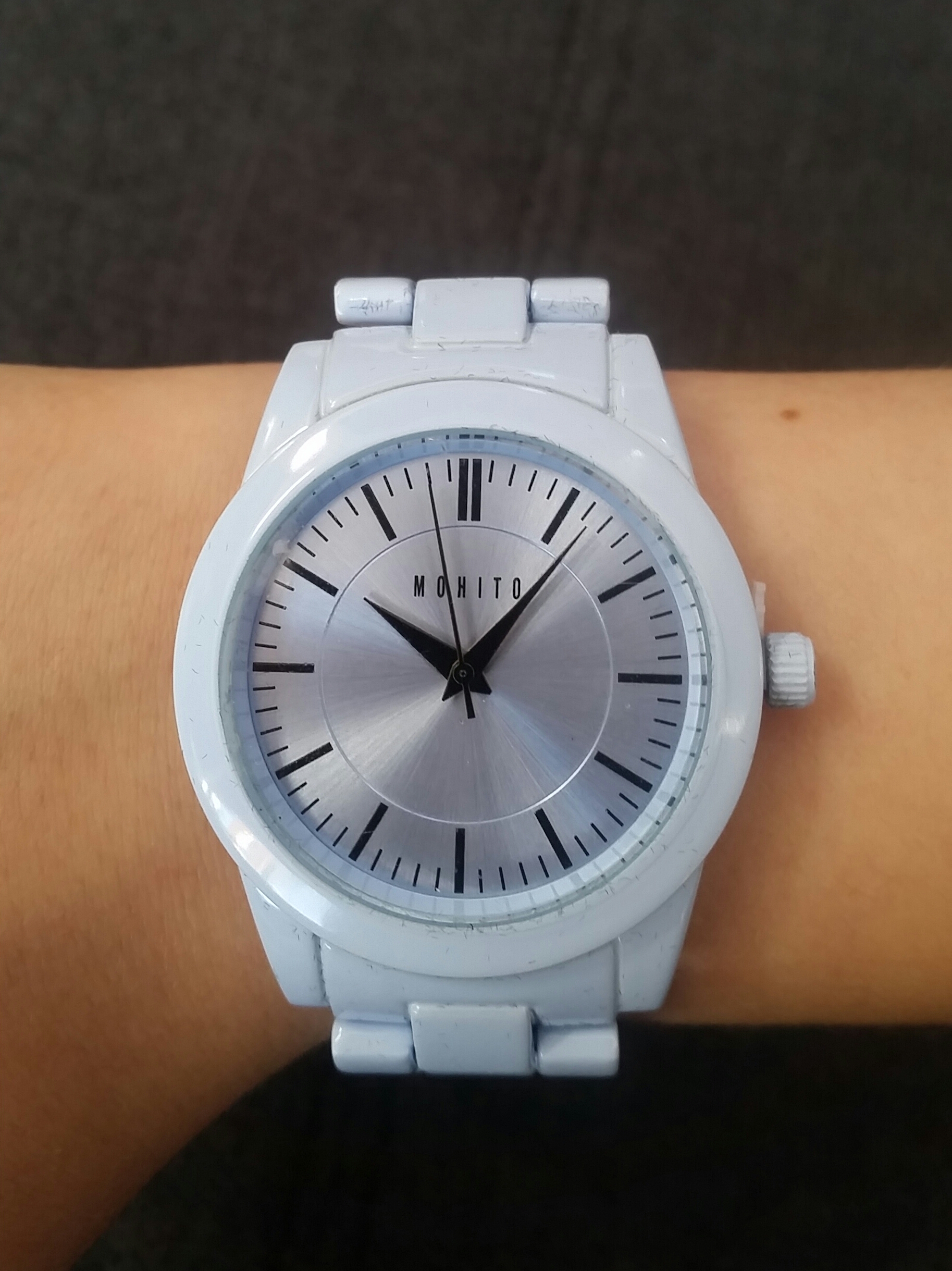 Co do samego koloru – błękit to moja wielka miłość. Kolor nieba, wiosny, choć dość trudny świetnie sprawdza się zarówno w makijażu jak i w stylizacjach. Na szczęście znowu modny, dlatego w sklepach już pojawiła się gama błękitnych dodatków. Pokusiłam się jescze o piękny zegarek: