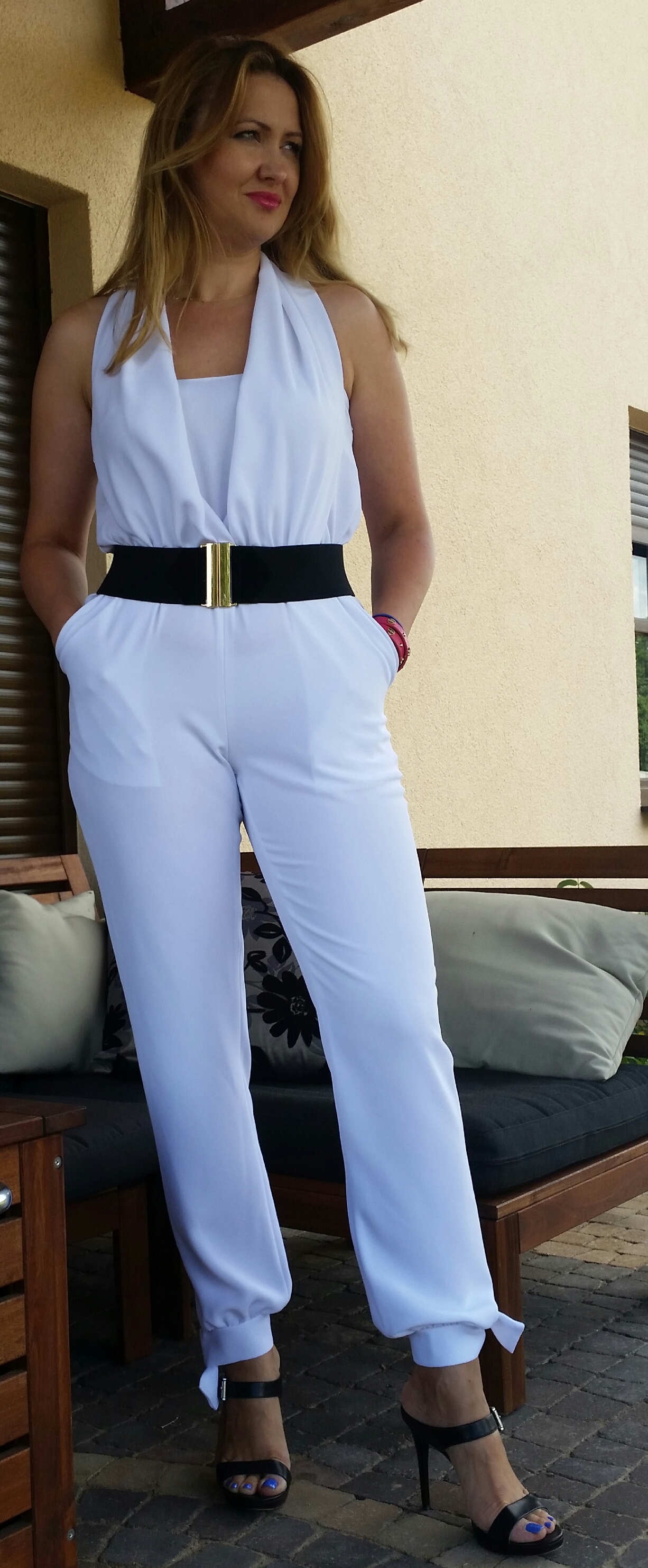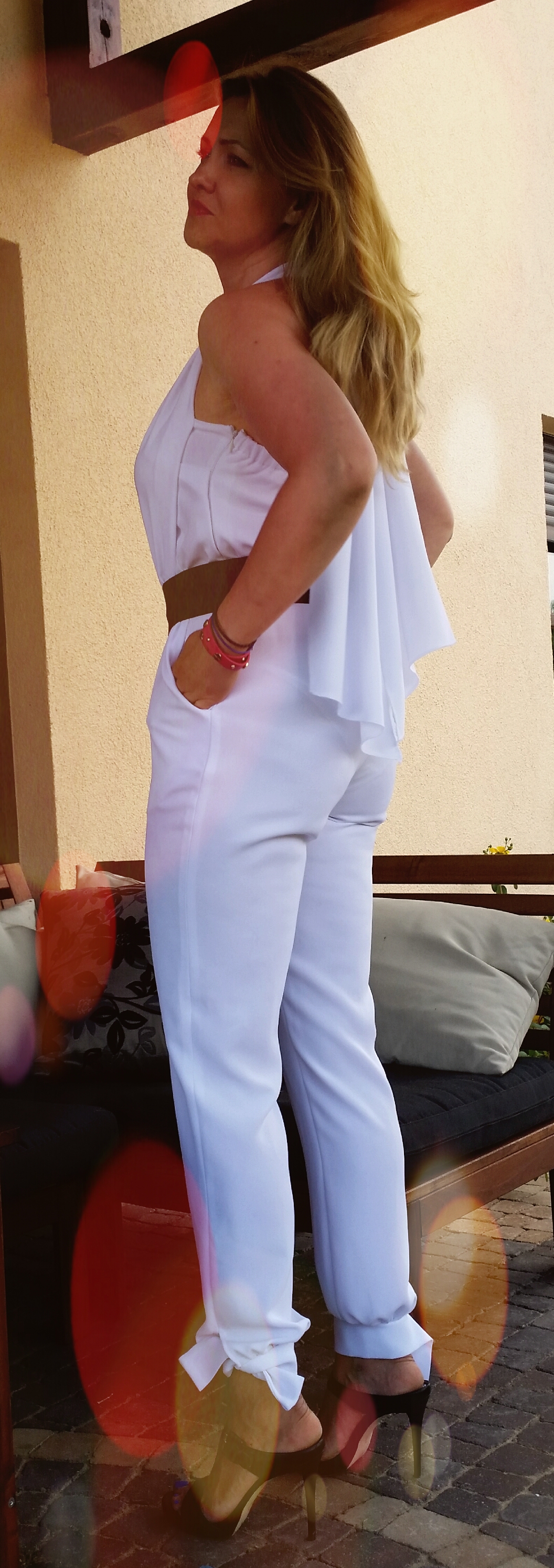 Tak więc, moje kochane po40-stki w końcu udało mi sie zrealizować zamysł zaprojektowania kreacji, która spełnia wszystkie moje oczekiwania – wyszczupla,wydłuża sylwetkę, zakrywa co trzeba i jest na topie.Kombinezon który stworzyłam z myślą o przyjęciu weselnym (dlatego bardzo ozdobne, długie ,powłóczyste wiązania z tyłu, które dodają kreacji lekkości i elegancji ) jest perfekcyjny.
