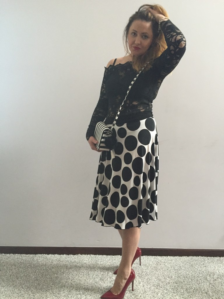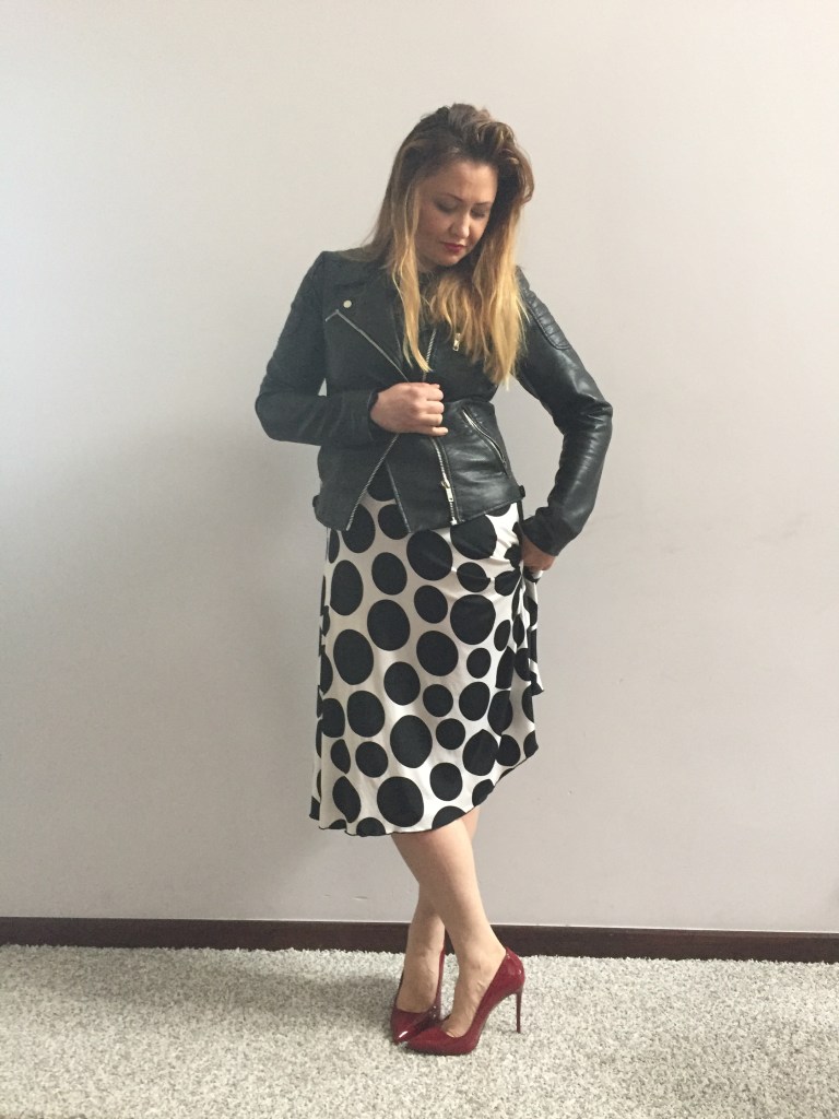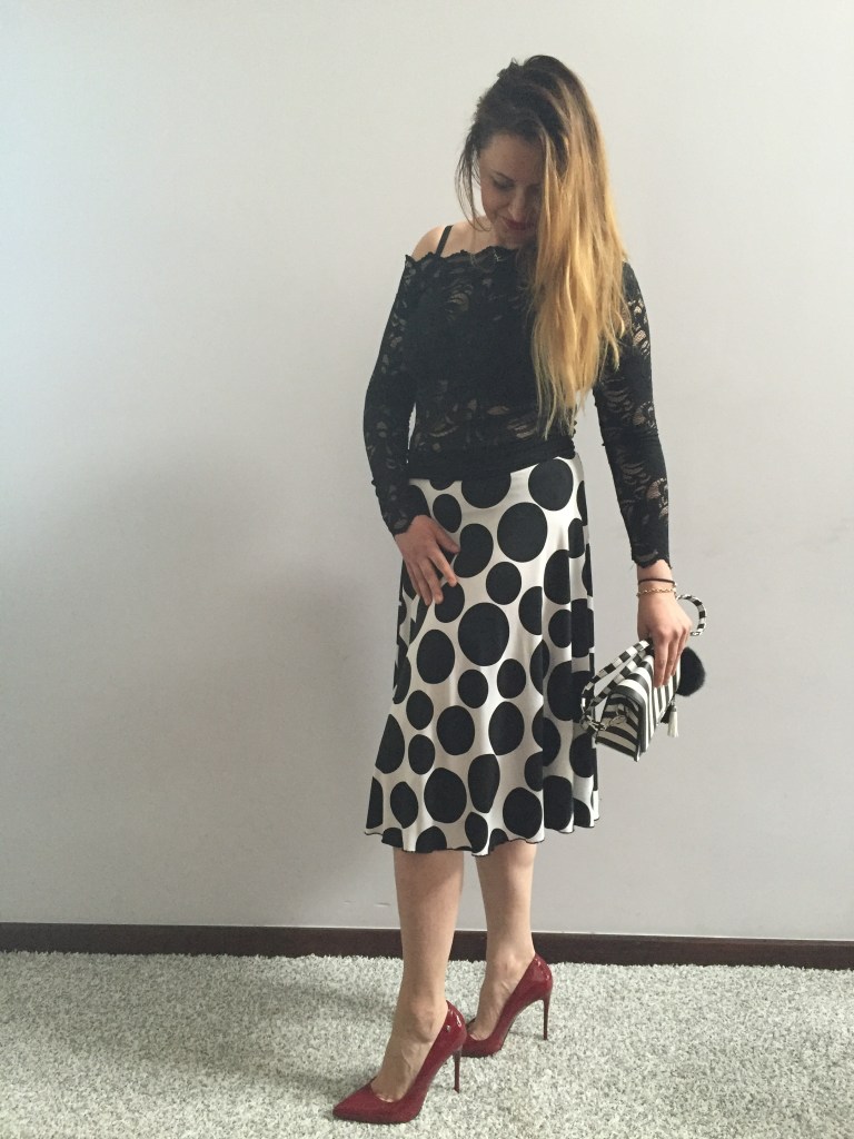 Oczywiście nie byłabym sobą, gdybym nie dokonała zakupów. Mój wzrok przykuła sukienka w grochy. Biała, zwykła kiecka w duże, czarne grochy. Jeżeli znudziła Wam się sukienka to prawie każdą można przerobić na spódnicę (o czym od razu pomyślałam). Chociaż spódnica midi w grochy hitem sezonu nie jest, to krój już tak. Szyta z półkoła pięknie układa się na sylwetce. Dodatki stylizacji przemycają ją do trendów tego sezonu. Wyszło rewelacyjnie. Zobaczcie sami: